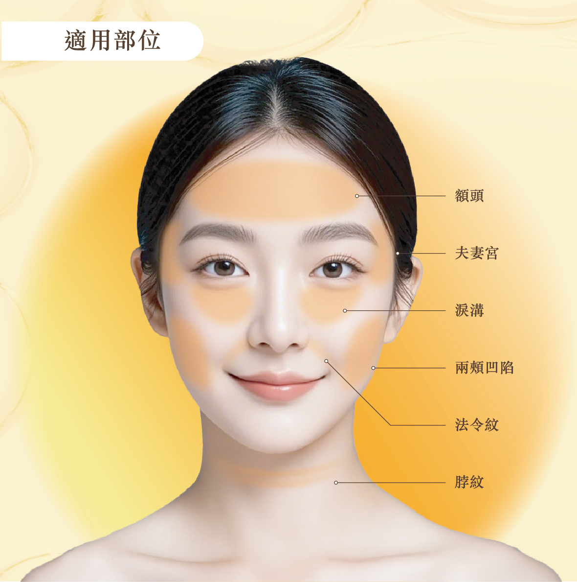 適用於額頭、夫妻宮、太陽穴、淚溝、法令紋、雙頰、脖紋等部位,打造立體飽滿輪廓