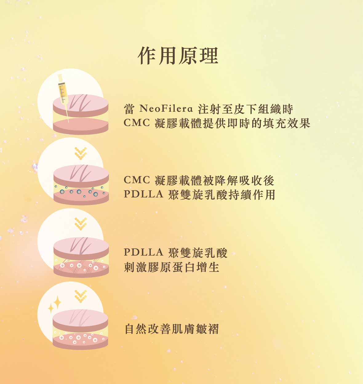 NeoFilera妮芙蕾是一款填補肌膚老化凹陷、啟動膠原蛋白增生的皮下填補注射劑,結合「PDLLA聚雙旋乳酸」刺激膠原蛋白增生的特性,及「CMC凝膠載體」的即時填充效果,有助於減少皺紋和細紋,改善皮膚的質地與彈性,讓肌膚重拾緊緻與彈潤。